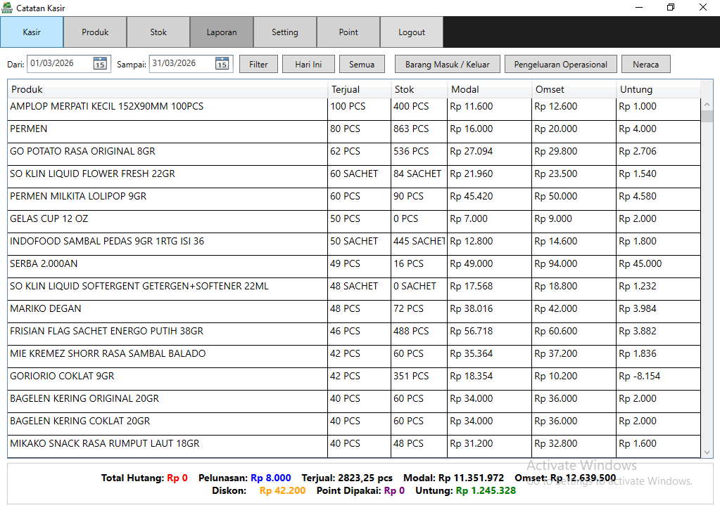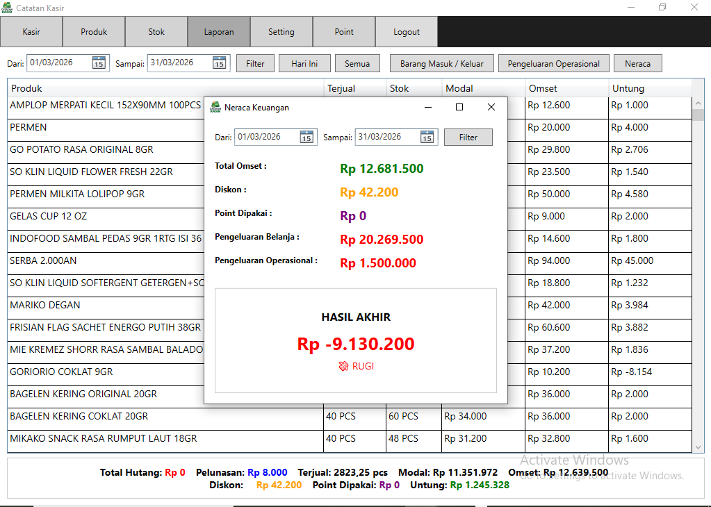 Laporan omset, modal, dan keuntungan ditampilkan secara detail dan mudah dipahami.